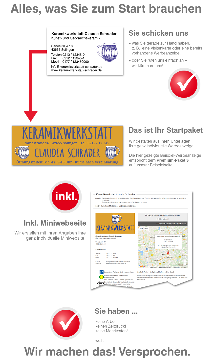 Unser Angebot beinhaltet eine Präsentation mit Ihrer individuell gestalteten Anzeige (z. B. Premium-Paket 3):